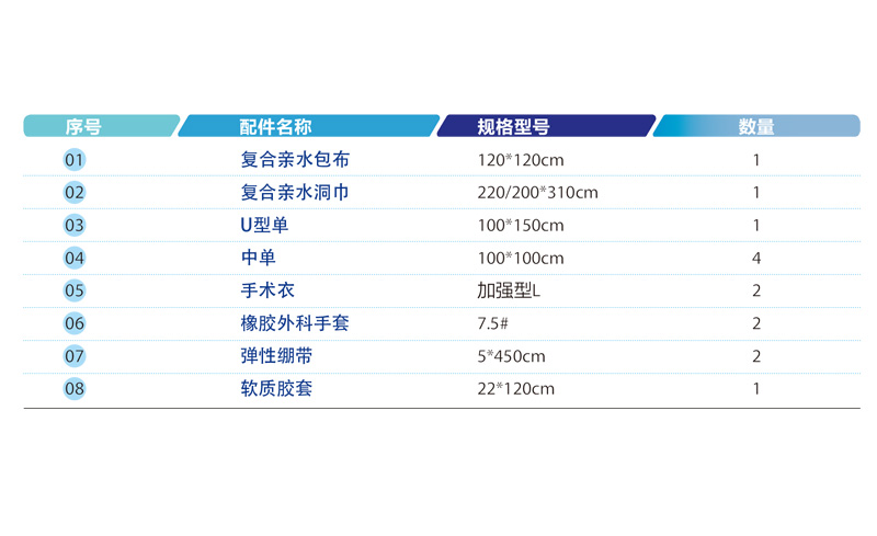 適用于髓關(guān)節(jié)部位手術(shù),產(chǎn)品主要由高性能無(wú)紡布制成的包布、洞巾、中單、U型單、手術(shù)衣和彈性繃帶、軟質(zhì)膠套等配件組合而成。洞巾手術(shù)關(guān)鍵部位配備有吸液層、彈性膜和集液袋,可根據(jù)臨床需要更改手術(shù)包內(nèi)配件數(shù)量。