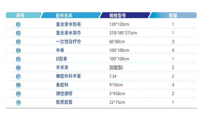 適用于上肢部位手術(shù),產(chǎn)品主要由高性能無(wú)紡布制成的包布、洞巾、一次性治療巾、中單、U 型單、手術(shù)衣和彈性繃帶、軟質(zhì)膠套等配件組合而成。洞巾 T 型設(shè)計(jì),手術(shù)關(guān)鍵部位配備有吸液層和彈性膜,可根據(jù)臨床需要更改手術(shù)包內(nèi)配件數(shù)量、配備積液袋,強(qiáng)化手術(shù)關(guān)鍵區(qū)域的阻隔能力。