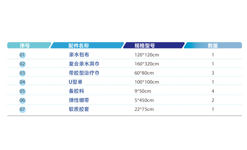 適用于肩關(guān)節(jié)部位手術(shù),產(chǎn)品主要由高性能無紡布制成的器械臺布、洞巾、一次性治療巾、U 型單和彈性繃帶、軟質(zhì)膠套等配件組合而成。洞巾手術(shù)關(guān)鍵部位配備有彈性膜和集液袋,可根據(jù)臨床需要更改手術(shù)包內(nèi)配件數(shù)量,配備具有更高防護(hù)等級的吸液層,強化手術(shù)關(guān)鍵區(qū)域的阻隔能力。