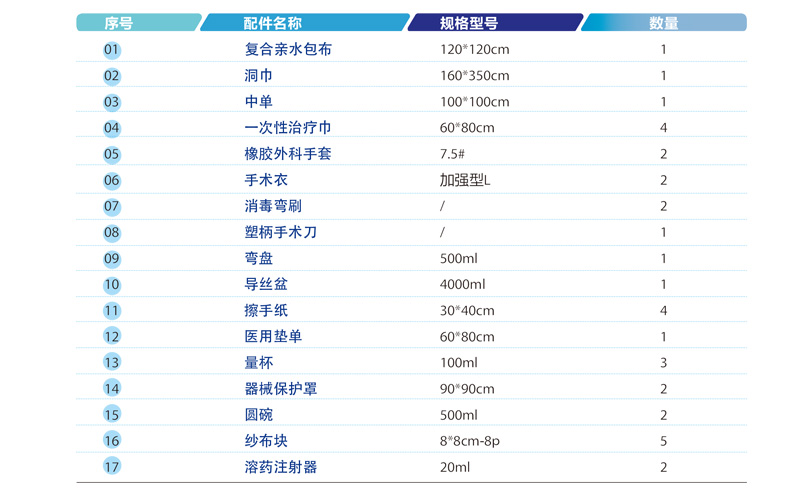 適用于介入手術(shù),產(chǎn)品主要由高性能無(wú)紡布制成的包布、洞巾、一次性治療巾、醫(yī)用墊和導(dǎo)絲盆、量杯、彎盤、器械保護(hù)罩等配件組合而成,可根據(jù)臨床需要更改介入包內(nèi)配件數(shù)量,增加開洞數(shù)量、配備具有更高防護(hù)等級(jí)的吸液層,強(qiáng)化手術(shù)關(guān)鍵區(qū)域的阻隔能力。