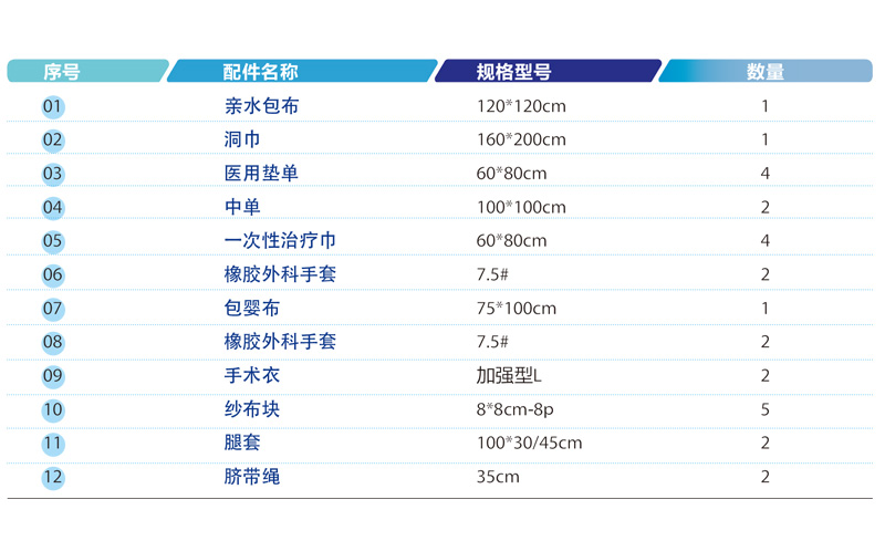 適用于婦產(chǎn)科手術(shù),產(chǎn)品主要由高性能無(wú)紡布制成的包布、醫(yī)用墊、手術(shù)衣和腿套、外科手套等配件組合而成,可根據(jù)臨床需要更改產(chǎn)包內(nèi)配件數(shù)量或配備嬰兒巾、臍帶繩等配件。